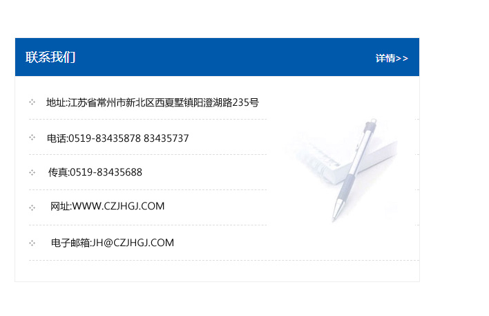 傳真:0519-83435688    郵編:213135    網址:WWW.czjhgj_com.sanshengjiahe.com    電子郵箱:JH@czjhgj_com.sanshengjiahe.com